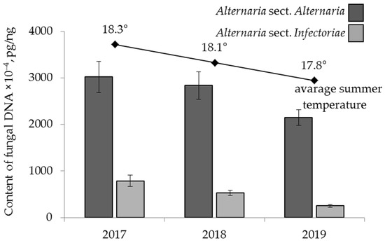 The amounts of DNA from the analysed fungi in the grain harvested in these years varied significantly. A substantial decrease in the amount of A. sect. Infectoriae DNA in grain, from 789 × 10−4 pg/ng in 2017 to 252 × 10−4 pg/ng in 2019, was observed (Figure 4). A similar trend was also found for the amount of A. sect. Alternaria DNA, from 3021 × 10−4 pg/ng in 2017 to 2150 × 10−4 pg/ng in 2019.