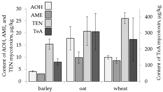 The content of AOH in oat grain samples was significantly higher (18 ± 5 µg/kg) than that found in wheat and barley. Barley was less contaminated with AOH and TEN than wheat (Figure 2). The mycotoxin AME was present only in one barley sample. The content of TEN in barley samples was, on average, lower (15 ± 2 µg/kg) than that in wheat and similar to that in oat. The difference between the average amounts of AME and TEN in wheat and oat grain samples was not detected. The content of TeA did not differ on average in the grain samples of all three cereals and reached 261 ± 133 µg/kg for wheat, 120 ± 20 µg/kg for barley and 309 ± 112 µg/kg for oat.