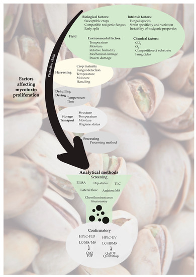 Major factors influencing mycotoxin proliferation along the food chain and main analytical methods for screening and confirmatory determination of mycotoxins in pistachios (ELISA—Enzyme-Linked Immunosorbent Assay; FLD—Fluorescence detector; HPLC—High-Performance Liquid Chromatography; HRMS—High-Resolution Mass Spectrometry; LC—Liquid Chromatography; MS—Mass Spectrometry; MS/MS—Tandem Mass Spectrometry; Q-Orbitrap—Quadrupole-orbital ion trap; QqQ- Triple Quadrupole; QqTOF—Double Quadrupole-TOF; TLC—Thin-layer chromatography; TOF—Time-of-flight).