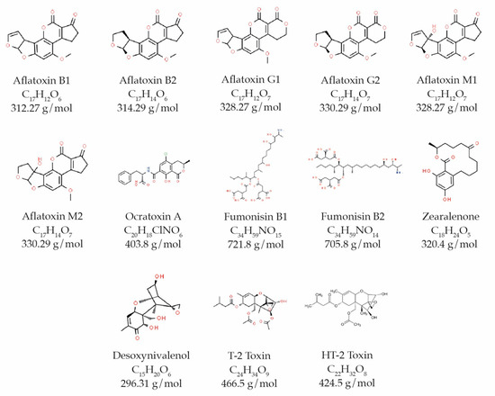 Examples of the main mycotoxins’ most common determinate in foods (structures from www.chemspider.com (accessed on 11 May 2021)).