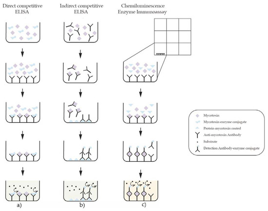 There are variations of this assay, depending on the characteristics of the antigen and matrix. Competitive ELISA assay is based on competition for antibody binding sites [64]. There are two versions of competitive ELISA: Direct and indirect (Figure 3).
