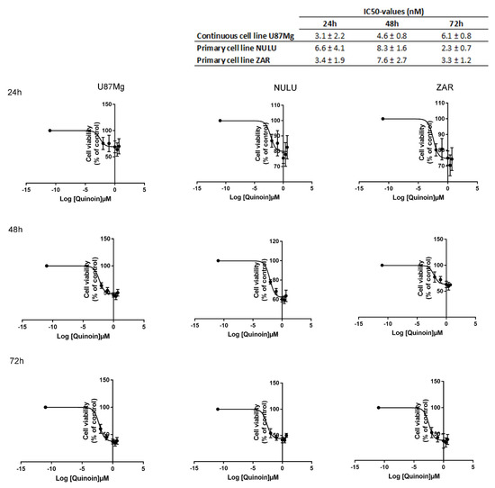 IC50 values estimation. IC50 values of U87Mg cells and two primary glioblastoma cell lines NULU and ZAR after 24, 48, and 72 h of incubation with quinoin using concentrations of 0.01, 0.1, 1.0, 2.5, and 5.0 μM. The control was assumed as part of the dose–response curve, considering it as a very low concentration (10−11 µM). Data were processed using GraphPad Prism and data are reported as Mean ± SD.