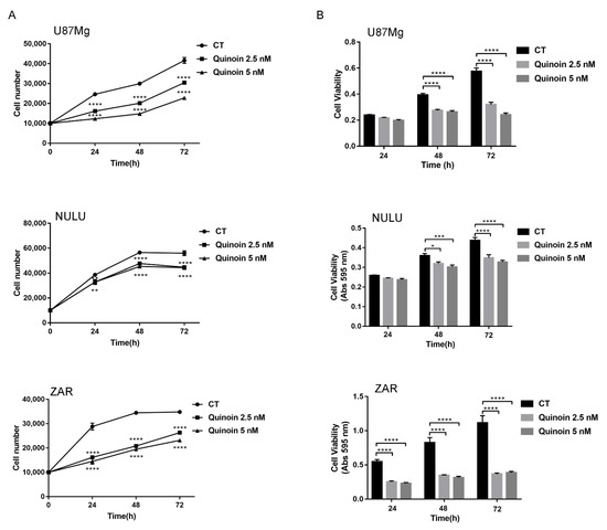 The cytotoxicity of quinoin on glioblastoma cells, evaluated by MTT assay, revealed a significant reduction of the cell metabolic activity at concentrations of 2.5 and 5.0 nM. In particular, the primary cell line ZAR proved to be the most sensitive to quinoin treatment among the three glioblastoma cell lines, exhibiting a high response after 24 h of exposure (Figure 2B).