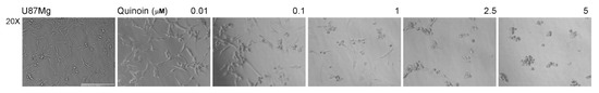 Morphological change of quinoin-treated U87Mg. The glioblastoma continuous cell line was exposed to 0.01, 0.1, 1.0, 2.5, and 5.0 μM quinoin for 72 h. Cells were imaged with an Evos FL microscope at 20× magnification.