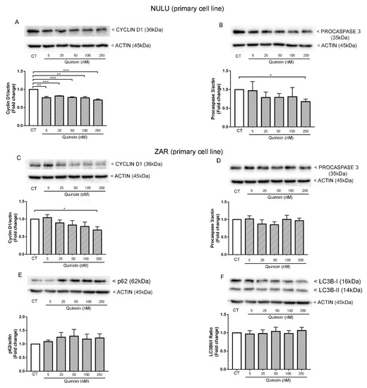 Western blot analysis of quinoin-treated primary cell lines for 24 h. (A) Quinoin induced a significant time-independent reduction of Cyclin D1 and (B) activation of apoptosis by a decrease of procaspase 3 when administered at a concentration of 250 nM in the NULU cell line. (C) Western blot analysis of the expression of Cyclin D1, (D) procaspase, and autophagic markers p62 (E) and LC3B (F) after treatment of the ZAR cell line with different concentrations of quinoin for 24 h. Densitometric analysis of protein levels represent the means ± SEM of three individual determinations. Data were normalized to the housekeeping gene actin and are expressed as a fold change over control-treated cells. * Unpaired t-test. According to GraphPad Prism, * p-value 0.01 to 0.05 (significant), ** p-value 0.001 to 0.01 (very significant), *** p-value 0.0001 to 0.001 (extremely significant).
