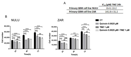 Primary GBM cell lines NULU and ZAR were plated in 48 wells at a density of 1 × 104 cells/well and treated with TMZ 1.0 μM either alone or in combination with quinoin 2.5 nM for 24, 48, and 72 h. After each treatment, the cells were counted through a Burker chamber.