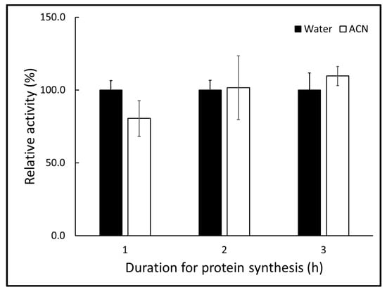 Comparisons of relative β-galactosidase activity after protein synthesis in the cell-free in vitro system with water (100%) or ACN added instead of trichothecene solution. Bars represent the mean ± standard deviation. There were no significant differences (p > 0.05) between the protein synthesis in experiments with water or ACN.