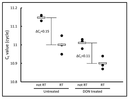 Effect of 2.5 μg/mL DON treatment on transcription. Comparisons of Ct values of reverse-transcribed (RT) sample and not reverse-transcribed (not RT) sample. The “RT” samples contained unremoved plasmid DNA and cDNA. The “not RT” samples did not contain cDNA.