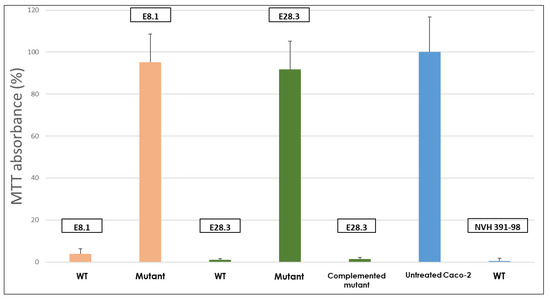 2.2. Cytotoxicity of B. cytotoxicus Wild-Type Strains E28.3 and E8.1, Their Derived Mutants Lacking the cytK-1 Gene and the Complemented Mutant