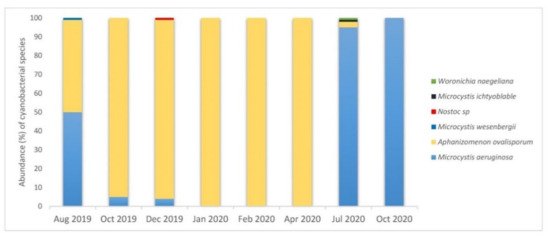 Abundance (%) of cyanobacterial species in Lake Karaoun per sampling month (August 2019–October 2020).