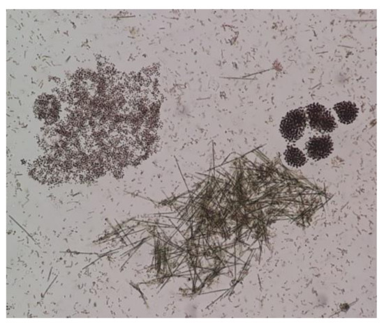 During the period of field campaigns (2019–2020), the diversity of cyanobacteria in the reservoir was limited (Figure 1). Aphanizomenon ovalisporum was the dominant species (>95%) from October 2019 to April 2020, while Microcystis aeruginosa was the most abundant on July and October 2020. In August 2019, both Microcystis aeruginosa and Aphanizomenon ovalisporum were equally present with abundances of 50% and 49%, respectively. In addition, in July of the same year, Microcystis ichtyoblable and Woronichia naegeliana were identified in very low abundances, of 1% each. A microscope image of the dominant cyanobacterial species, i.e., Microcystis aeruginosa and Aphanizomenon ovalisporum is shown in Figure 2.