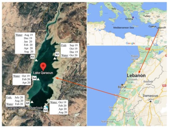 During field campaigns that covered the wet and dry periods, 16 water samples along with a total of 9 specimens of Cyprinus carpio fish (weighing 215 g on average) were collected mainly by the national Litani River Authority. All water samples were collected in polyethylene bottles from 5 sampling points of Lake Karaoun (S1, S2, S3, S4 and S5). S1 was located close to the river input at the west bank, S2 was east of the dam, S3 was close to the river input at the east bank, S4 was in the middle of the lake and S5 was at the dam (Figure 4). Water samples were transported in coolers (at a temperature of 4 °C) for laboratory analysis in Beirut, Lebanon and Athens, Greece. The fish were kept on ice and were sacrificed within 24 h. Fish liver and muscle sub-samples were labeled and frozen separately at −20 °C. The frozen fish tissue samples were then lyophilized with a Labconco freeze-dryer for 48 h at −84 °C and 0.2 mbar and powdered using a pestle and a mortar.
