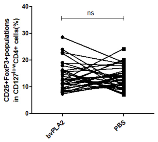 It is controversial whether the frequency of Tregs reflects the severity of diseases such as RA [45,46]. Sometimes, increased Tregs at the site of inflammation of a pathological model or a patient did not function properly [45]. Tregs are believed to increase at an early stage of disease, to inhibit disease progression, and to decrease at an irreversible severe stage, producing less inflammation [47,48,49]. Increasing the number of peripheral Tregs was one of the key factors in the mechanism of and clinical response to new therapeutic material candidates modulating the immune system. Previous reports have indicated that peripheral-blood-derived Tregs from healthy donors were present at a higher frequency than those in a pathological model or patients [45,46]. The condition of the study subjects could therefore affect the degree of change induced by bvPLA2, resulting in findings with no statistical significance.