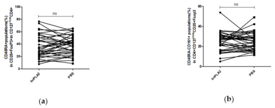 To investigate the effect of bvPLA2 on the increased Treg in hPBMCs, the percentages of CD45RA+ population and CD45RA−CD161+ population in the CD4+CD25+CD127lowFoxp3+ Tregs were further analyzed (Figure 2e) as Treg sub-populations, naïve Tregs, and proinflammatory Tregs respectively. Although there were no significant differences, the percentage of the CD4+CD25+CD127lowFoxp3+CD45RA+ naïve Treg cells (n-Tregs) was higher in the bvPLA2 group than in the control (mean of differences = −1.8340, p = 0.3934) (Figure 4a) and the percentage of the CD4+CD25+CD127lowFoxp3+CD45RA−CD161+ inflammatory Tregs (i-Tregs) in the bvPLA2 group was similar with that in the control group (mean of differences = −0.1418, p = 0.9238) (Figure 4b).