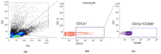 All FACS data were acquired using a FACSLyric™ (BD Biosciences, San Jose, CA, USA) and analyzed using FACSuite software (BD Biosciences, San Jose, CA, USA). Measurements of the population of CD11c+CD206+ DC cells were obtained by using a gating strategy on peripheral blood samples stained with anti-CD11c and anti-CD206 to detect the specific surface markers of monocytes (Figure 5). Peripheral blood mononuclear cells (PBMCs) treated with the Treg expansion kit were gated for CD127low and CD4+ T cells, and the percentage of CD4+CD25+CD127lowFoxp3+ was identified in the Tregs (Figure 2). Naïve Tregs were identified as CD45RA+ in CD4+CD25+CD127lowFoxp3+ Tregs, and inflammatory Tregs were identified as CD45RA−CD161+ in CD4+CD25+CD127lowFoxp3+ Tregs (Figure 2e).