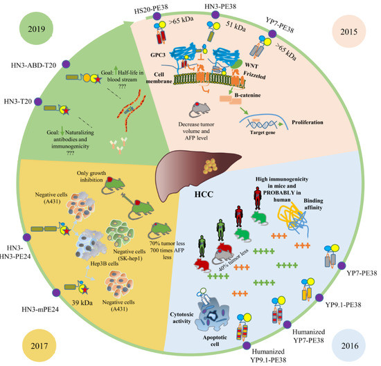 GPC3-targeted immunotoxins. Immunotoxins that target the GPC3 receptor were introduced from 2015 to now. Those studied by the same research group in the same year were compared together and presented in an identical background stain.