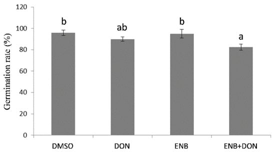 Germination of bread wheat seeds in response to single or combined deoxynivalenol (DON) and enniatin B (ENB) applications. Germination rate (%) was quantified in four independent experiments using 10 seeds per treatment in each of the experimental trials. In all experiments, for each test, the same volume and concentration of dimethyl sulfoxide (DMSO) was used as a control. Data represent the mean ± standard error. Different letters indicate significant differences in mean values (p ≤ 0.01, one-way ANOVA, Tukey’s HSD test).