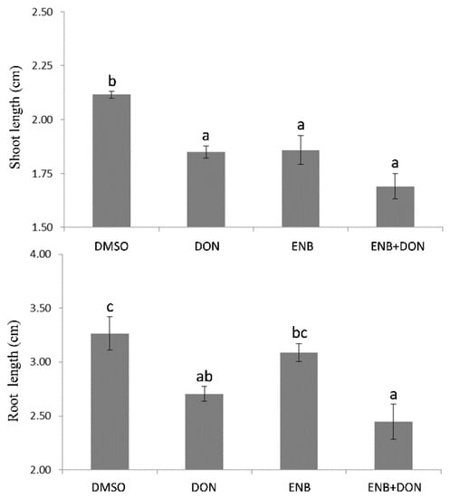 Effects of single or combined DON and ENB applications on bread wheat growth. In all experiments, for each test, the same volume and concentration of DMSO was used as a control. Data represent the mean ± standard error of four independent experiments. For each experiment, 10 replicates per treatment were analyzed. Different letters indicate significant differences in mean values (p ≤ 0.01, one-way ANOVA, Tukey’s HSD test).