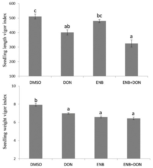 Vigor of bread wheat seedlings after single or combined DON and ENB applications. In all experiments, for each test, the same volume and concentration of DMSO was used as a control. Data represent the mean ± standard error of four independent experiments. For each experiment, 10 replicates per treatment were analyzed. Different letters indicate significant differences in mean values (p ≤ 0.01, one-way ANOVA, Tukey’s HSD test).