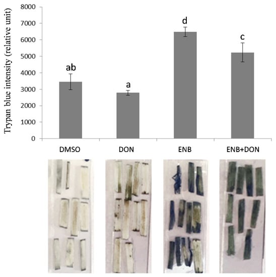 Quantification of cell death by trypan blue staining after single or combined DON and ENB applications. In all experiments, for each test, the same volume and concentration of DMSO was used as a control. Cell death was assessed by the intensity of trypan blue staining after seven days, as measured by ImageJ software. Data represent the mean ± standard error of three independent experiments with 8–10 leaf segments/treatment for each experiment. Different letters indicate significant differences in mean values (p ≤ 0.01, one-way ANOVA, Tukey’s HSD test). A representative image of stained plant tissues is shown below the histogram.