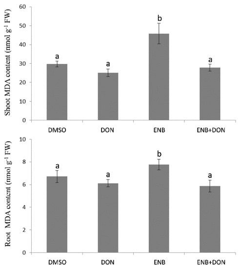 The content of malondialdehyde (MDA) (an indicator of lipid peroxidation and a commonly accepted marker of oxidative stress) significantly increased, in both shoots and roots, after treatment with ENB (10 mg kg−1) (Figure 5). A greater increase (+54%) in shoots than that detected in roots (+29%) was observed (Figure 5). In contrast, DON (10 mg kg−1) did not induce significant changes in lipid peroxidation in either shoots or roots (Figure 5). Additionally, no significant changes in MDA content in comparison to the control were detected in the shoots and roots of seedlings treated with the combination of the two compounds, indicating that in DON+ENB co-application, DON inhibits the induction of lipid peroxidation caused by ENB (Figure 5).