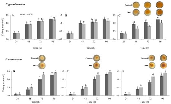 Effects of three DON concentrations on the in vitro growth of Fusarium graminearum (FG) and Fusarium avenaceum (FA). Seven replicates were performed for each concentration of DON and its controls (cnt). Data represent the mean ± standard error of three independent experiments. Different letters indicate significant differences in mean values (p ≤ 0.01, two-way ANOVA, Tukey’s HSD test). A representative image is provided above the histograms showing statistically significant differences between controls and treatments. (A,D): 10 mg kg−1; (B,E): 50 mg kg−1; (C,F): 100 mg kg−1.