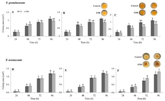 Effects of three ENB concentrations on the in vitro growth of FG and FA. Seven replicates were performed for each concentration of ENB and its controls. Data represent the mean ± standard error of three independent experiments. Different letters indicate significant differences in mean values (p ≤ 0.01, two-way ANOVA, Tukey’s HSD test). A representative image is provided above the histograms showing statistically significant differences between controls and treatments. (A,D): 10 mg kg−1; (B,E): 50 mg kg−1; (C,F): 100 mg kg−1.