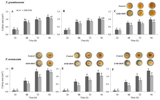 To assess the activity of ENB and DON on FA and FG growth, the development of the two strains in the presence of the two mycotoxins, individually and in combination, was evaluated. The effects of ENB and DON on fungal colony growth were quantified by calculating the area of the fungal colony (cm2) reached after 24, 48, 72, and 96 h of incubation following the incorporation of each mycotoxin at concentrations of 10, 50, and 100 mg kg−1 to the growth media.