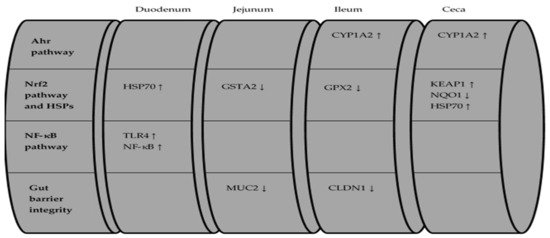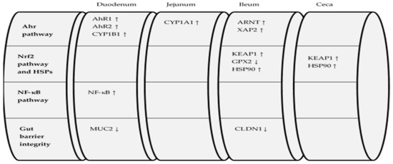 Oxidative stress is also known to be related to intestinal immune and epithelial dysfunctions [25,26]. The activation of nuclear transcription factor-κB (NF-κB) is triggered by the activation of Toll-like receptors (TLRs) in the intestinal cell surface, and this pathway is responsible for the induction of inflammatory responses [27]. While there are indications that DON and FUM increased the expression of NF-κB pathway-related genes mainly in the broiler jejunum [5,6,28,29,30], still more work involving intestinal profiling for critical relevant genes is required.