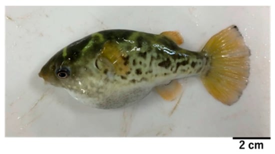 Tetrodotoxin (TTX), a potent neurotoxin, is the main toxin component of marine pufferfish of the genus Takifugu, including Takifugu rubripes and Takifugu pardalis, which inhabit the coastal waters of Japan [1,2,3]. Organs such as the liver, ovary, and, in some species, the skin, are generally highly toxic, while the muscle and testes are nontoxic or only weakly toxic [2,4,5]. While the exact source of the TTX in pufferfish is unclear, it is thought to accumulate via the food chain starting with TTX-producing bacteria [2]. Saxitoxins (STXs) are the main toxin group found in freshwater pufferfish, such as Pao and Leiodon (both formerly known as Tetraodon), inhabiting the coastal waters of Southeast Asian countries [6,7,8,9,10]. In these freshwater pufferfish, high concentrations of the toxin accumulate in the skin and ovary, whereas relatively low concentrations are usually detected in the liver [8,9,10,11]. STXs are a group of neurotoxins associated with the toxification of bivalves [12]. STX, which is the best-known component of STXs, shares a similar molecular weight, toxicity, and intoxication mechanism as TTX [12]. While freshwater pufferfish generally contain only STXs, some marine species, such as Sphoeroides pufferfish from Florida, Arothron and Canthigaster pufferfish from the Philippines, Japanese coastal waters, or the Caribbean Sea contain both TTX and STXs [13,14,15,16,17]. Like TTX, STXs in these pufferfish are thought to accumulate from exogenous sources, i.e., the food chain that starts with STX-producing dinoflagellates in marine environments and STX-producing cyanobacteria in freshwater environments [7,13,15,16,18,19].