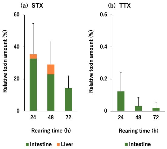 Relative tetrodotoxin (TTX) (a) and saxitoxin (STX) (b) amount (% of the administered dose) in each tissue of D. fluviatilis at 24, 48, and 72 h after TTX/STX administration. Data are shown as means (columns) and standard deviations (SDs) (error bars) of 3 individuals. Note that the scales on the vertical axis differ between STX and TTX by a factor of 100.