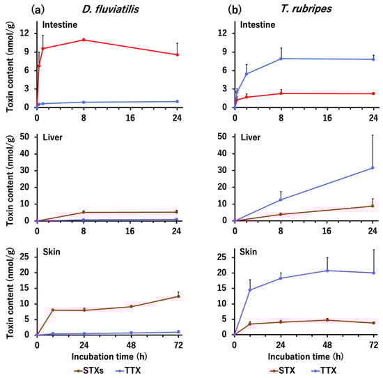 In the in vitro tissue slice incubation experiment, intestine, liver, and skin tissue slices were prepared from artificially reared nontoxic D. fluviatilis and T. rubripes, and incubated with buffer containing TTX (20 nmol/mL) and STXs (neosaxitoxin (neoSTX), 10 nmol/mL; dcSTX, 1 nmol/mL; STX, 9 nmol/mL) for D. fluviatilis; and TTX (20 nmol/mL) and STX (20 nmol/mL) for T. rubripes up to 24 or 72 h, and the amount of toxin taken up by each tissue slice over time was quantified (Figure 3). All of the D. fluviatilis tissues took up much more STXs than TTX. The STXs content in the intestine tissue increased rapidly within 1 h, reached a maximum (11.0 nmol/g) at 8 h, and then decreased slightly. The STXs content in the liver was lower than that in the other tissues (5.2 nmol/g at 24 h), but the STXs content in the skin increased rapidly by 8 h, and then further increased to 12.4 nmol/g at 72 h. In contrast, the TTX content in any tissue did not exceed 1 nmol/g. In all tissues examined, the amounts of STXs and TTX differed significantly (p < 0.05) at all incubation times evaluated. In strong contrast to D. fluviatilis, the amount of TTX uptake greatly surpassed that of STX in T. rubripes. In the intestine and skin, the TTX content increased immediately and reached a maximum (7.9 and 20.8 nmol/g) at 8 h and 48 h, respectively, and then plateaued, whereas, in the liver, the TTX content increased linearly and was highest (31.5 nmol/g) at 24 h. In contrast, the maximum STX content was only 2.3 nmol/g in the intestine, 8.7 nmol/g in the liver, and 4.7 nmol/g in the skin. In the intestine and skin, the amounts of TTX and STX differed significantly (p < 0.05) at all incubation times evaluated except at 72 h in the skin.