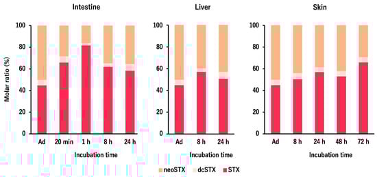 Changes in the molar ratio of each STXs component taken up by D. fluviatilis tissue slices are shown in Figure 4. The ratio of neoSTX, dcSTX, and STX in the STXs added to the incubation buffer was 50%, 5%, and 45%, respectively, but in the STXs taken up in the tissue slices, the ratio of neoSTX (16.1–43.8%) was lower and the ratio of STX (50.6–81.9%) was generally higher than the initial ratios in all tissues. No obvious change in the ratio of dcSTX (2.0–6.3%) was observed.