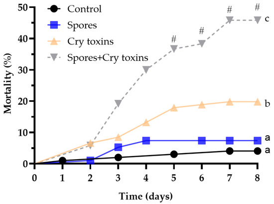 Mortality of Colorado potato beetle larvae following oral treatment with Bacillus thuringiensis spores and Cry3A toxins. The control consisted of administering PBS alone (no spores or toxins). Data were analysed by comparing curves using Log-rank (Mantel–Cox) tests (n = 100 larvae per treatment). The hashtag (#) denotes differences between treatments (binomial test) at timepoints 5–8. Unshared letters represent significant differences (p < 0.05).