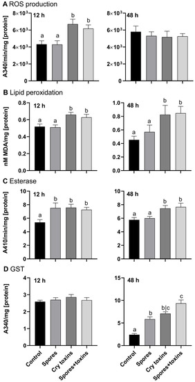 Reactive oxygen species (ROS) generation (A), lipid peroxidation (B), esterase (C) and glutathione-S-transferase (GST) (D) activities in the midgut of Colorado potato beetle larvae treated with Bacillus thuringiensis spores and Cry3A toxins. The negative control consisted of administering PBS alone (no spores or toxins). Panels in the left column are measures taken at 12 h and panels in the right column are measures taken at 48 h post inoculation. Data represent mean ± SE. Unshared letters represent significant differences (p < 0.05), determined via ANOVA or Kruskal–Wallis (with Dunnett’s or Dunn’s multiple comparisons).