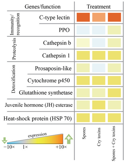 Differential levels of candidate gene expression (i.e., mRNA) were observed for anti-infective, detoxification and antioxidant factors in the larval midgut 48 h.p.i. with Bt spores, Cry toxins and a combined dose of spores/Cry toxins. Immune-related prophenoloxidase (PPO) remained mostly unchanged, whereas the pathogen recognition (galactose-specific) C-type lectin was upregulated up to 12-fold when compared to the control (Figure 4). Both cathepsins (b and 1) displayed increased expression between 1.5 and 3-fold—these proteases contribute to lysosomal destruction of endogenic and exogenic molecules. Detoxification and stress response factors were also upregulated: 1.5 to 2-fold for proactivator polypeptide prosaposin-like protein, 2 to 3-fold for cytochrome p450 monooxygenase and 1.5 to 2-fold for glutathione synthetase, 1.5 to 3-fold for HSP 70 and juvenile hormone esterase (Figure 4, Supplementary Material Figure S1).