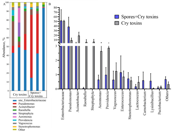 Bacterial microbiome (16s rRNA) profiles in the midgut of Colorado potato beetle larvae treated with Bacillus thuringiensis spores and Cry3A toxins. DNA was extracted 48 h post inoculation. (A) Bacterial abundance with each biological replicate (n = 3 per treatment) displayed. (B) Genus-level comparisons. Data represent Mean ± SE (* p < 0.05; ** p < 0.01compared with the control within the same genus).