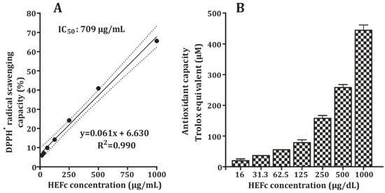 The results of the free radical scavenging activity of the HEFc are presented in Figure 1. The HEFc quenched DPPH free radicals in a concentration-dependent manner. The antioxidant assay produced values in the range of 21 ± 4.5–430 ± 27.8 µM Trolox. At 16 µg/mL, HEFc showed a low DPPH inhibition of 6%, and at 1000 µg/mL, it resulted in 65% DPPH inhibition. In addition, the IC50 value was found to be 709 µg/mL.