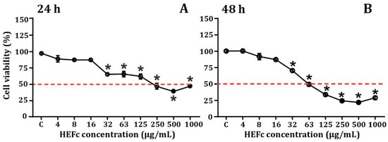 Efect of HEFc on SH5YSY viability. (A) Cytotoxicity effects in undifferentiated human neuroblastoma cells exposed to HEFc for 24 h, (B) Cytotoxicity effects in undifferentiated human neuroblastoma cells exposed to HEFc for 48 h. * p ˂ 0.05, representing a significant difference compared to the control. Data are mean ± SEM (n = 3), one-way ANOVA post Sidak’s multiple comparisons test.