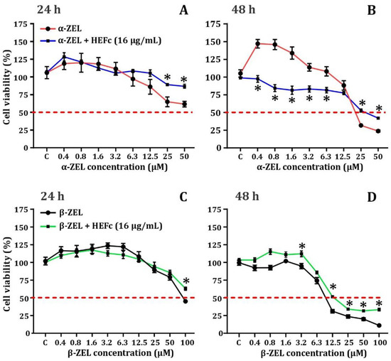 Cell viabillity in SH-SY5Y exposed to α-ZEL/α-ZEL/HEFc (A,B) or β-ZEL/β-ZEL/HEFc (C,D) over 24 (A,C) and 48 h (B,D). * p ˂ 0.05, significant difference compared to the correspondiong metabolite tested alone. Data are mean ± SEM (n = 3). Multiple t-tests.