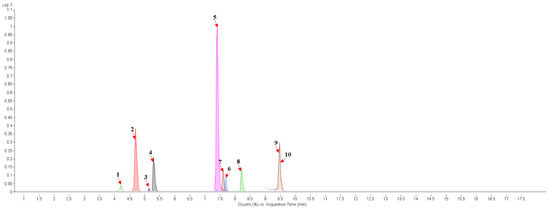 Chromatograms of Fridericia chica. Extract chromatogram Rt: 3–11 min. (extracted ion chromatogram, EIC), obtained by UPLC-MS/MS in positive ion mode. Numbers correspond to (1) vicenin-2; (2) 6-hydroxyluteolin 7-rhamnoside; (3) scutellarein-O-glucuronide; (4) nepetin; (5) pectolinarigenin; (6) hispidulin; (7) apigenin; (8) 5-O-methylscutellarein; (9) thevetiaflavone and (10) acacetin.