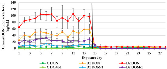 Mean urinary deoxynivalenol (DON) biomarker (DON and deepoxy-deoxynivalenol (DOM-1)) levels quantified during the experiment—14 days of experimental diets (C-control group, D1 and D2 group) and after substituting the contaminated diets for the control diet (day 15–28).