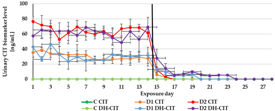 In the serum of the D2 group, lower concentrations of CIT were quantified (Table 2) as compared with urine and only traces of its metabolite DH-CIT. In the recent toxicokinetic analysis, CIT (10–100 ng/mL) as well as DH-CIT (0.3–0.7 ng/mL) were quantified in all plasma samples after the administration of boluses of 50 μg CIT/kg body weight [49], which is in accordance with the results of our study.