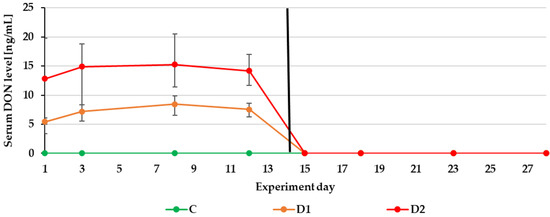 Mean serum DON levels quantified during the experiment—14 days of experimental diets (C-control group, D1 and D2 group) and after substituting the contaminated diets for the control diet (day 15–28).