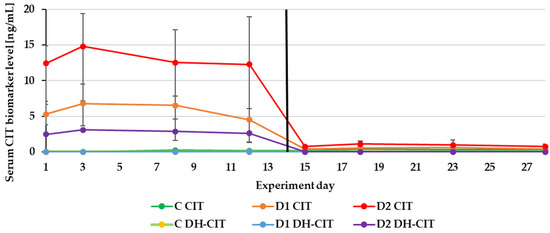 Mean urinary citrinine (CIT) biomarker (CIT and dihydrocitrinone (DH-CIT)) levels quantified during the experiment—14 days of experimental diets (C-control group, D1 and D2 group) and after substituting the contaminated diets for the control diet (day 15–28).