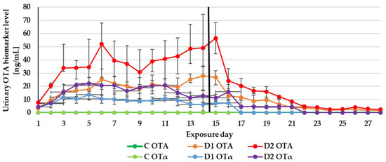 Mean urinary ochratoxin A (OTA) biomarker (OTA and ochratoxin alpha (OTα)) levels quantified during the experiment—14 days of experimental diets (C-control group, D1 and D2 group) and after substituting the contaminated diets for the control diet (day 15–28).