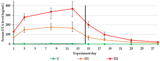 Mean serum OTA levels quantified during the experiment—14 days of experimental diets (C-control group, D1 and D2 group) and after substituting the contaminated diets for the control diet (day 15–28).