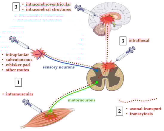 Routes of administration of BoNTs. Toxins are administered at different peripheral or central sites depending on their use in humans or animals: (1) peripheral BoNTs are normally injected intramuscular in humans/animals, or intraplantar, subcutaneous, on the whisker pad, or other routes in animal models; (2) peripheral BoNTs can be transported from the site of injection to CNS via retrograde axonal transport and transcytosis (red dotted lines) from motoneurons and/or sensory neurons toward central neurons; and (3) BoNTs may be administered directly to CNS via intrathecal injection at spinal cord or intracerebral level in animal models of spinal cord injuries or neurodegenerative diseases. Figure was produced by using free images taken from Servier Medical Art (http://smart.servier.com, accessed on 8 September 2021), a service to medicine provided by Les Laboratoires Servier (http://www.servier.com, accessed on 8 September 2021).