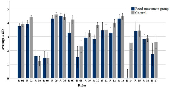 Degree of compliance with the 17 golden rules suggested by the BfR. Respondents were divided in two groups: participants in food movements (food-movement group) and non-participants (control). The scale in the Y axis represents the degree of compliance: 1: “I never follow”, 2: “I usually follow”, 3: “Partly/partly”, 4: “I follow most of the time”, 5: “I always follow”. The description of the single rules is presented in Table 2.