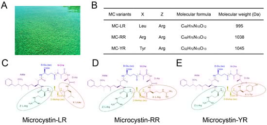 Characteristics of cyanobacterial blooms and microcystins: (A) cyanobacteria blooms in the San Francisco Estuary (photo provided by Dr. Peggy Lehman, California Department of Water Resources); (B) molecular formula and molecular weight of microcystin variants; (C) microcystin-LR, with the amino acid leucine (L) and arginine (R); (D) microcystin-RR, with the amino acid arginine (R) and arginine (R) and (E) Microcystin-YR, with the amino acid tyrosine (Y) and arginine (R).
